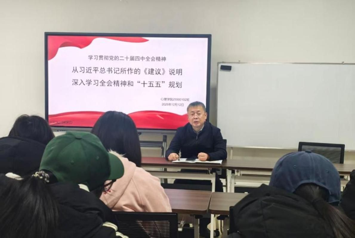 在宣讲中,白校长向同学们系统介绍了党的二十届四中全会召开的历史背景和重要意义。他指出,党的二十届四中全会是在全面建设社会主义现代化国家、向第二个百年奋斗目标进军的关键时期召开的一次重要会议,全会聚焦国家治理体系和治理能力现代化,为“十五五”时期乃至更长阶段的发展绘就了宏伟蓝图,也为青年一代成长成才指明了前进方向、提供了根本遵循。白校长强调,青年是国家未来、民族希望,新时代青年学子生逢其时,也肩负重任。他勉励同学们要深刻领会全会精神核心要义,将国家发展大局与个人学业规划紧密结合,以自身的确定性应对一切不确定性。一要扎根专业、锤炼本领,深耕心理学专业知识,既要夯实理论基础,又要注重实践应用,把专业能力打造成应对时代变化的核心底气,用专业所长服务社会民生;二要坚定信念、锚定方向,树立远大理想,涵养高尚品德,以稳定的心态和清晰的目标抵御成长路上的迷茫与浮躁,在时代浪潮中保持定力、行稳致远;三要拥抱变化、主动作为,保持旺盛的学习热情和较强的适应能力,把成长中的未知与挑战转化为突破自我的机遇,在攻坚克难中练就过硬本领。