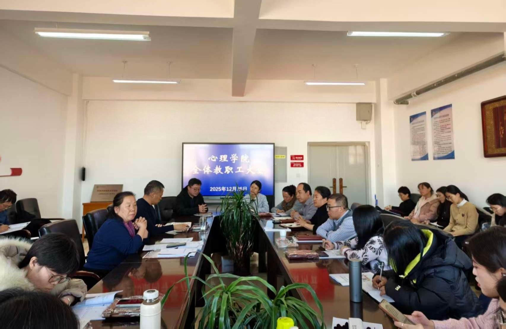 2025年12月25日,心理学院全体教职工大会在南区6号教学楼611会议室顺利召开。会议由学院党委书记许国宝主持,学院院长张潮,副院长韩琴、聂爱青、张睆,全体教职工参加了会议。