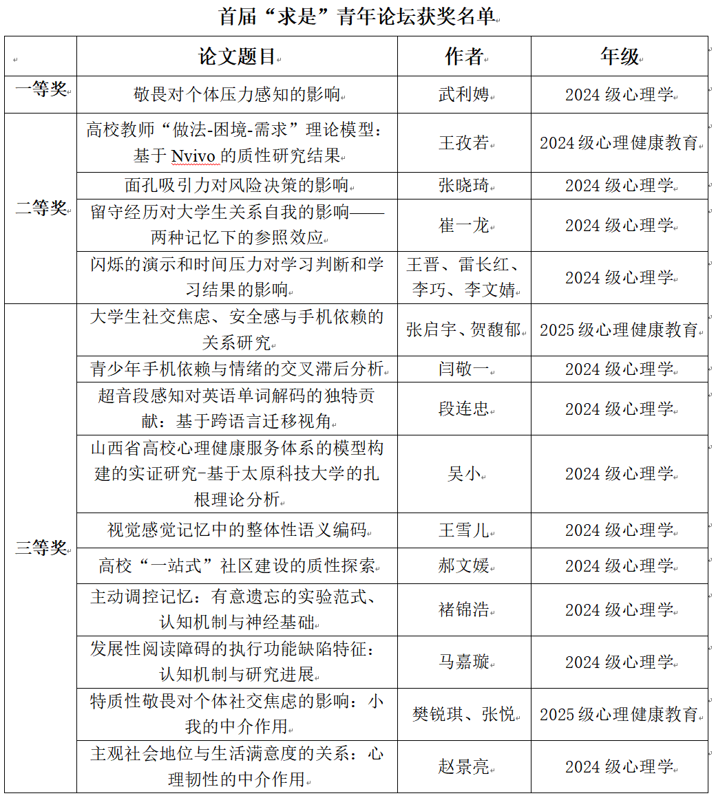 本次心理学院首届“求是”青年论坛通过科学完善的评分机制与多元立体的交流形式,集中展示了我院研究生在心理学各细分领域的研究成果,不仅为研究生搭建了常态化的学术交流与能力展示平台,更助力形成了开放互鉴、求真务实的学术风气。