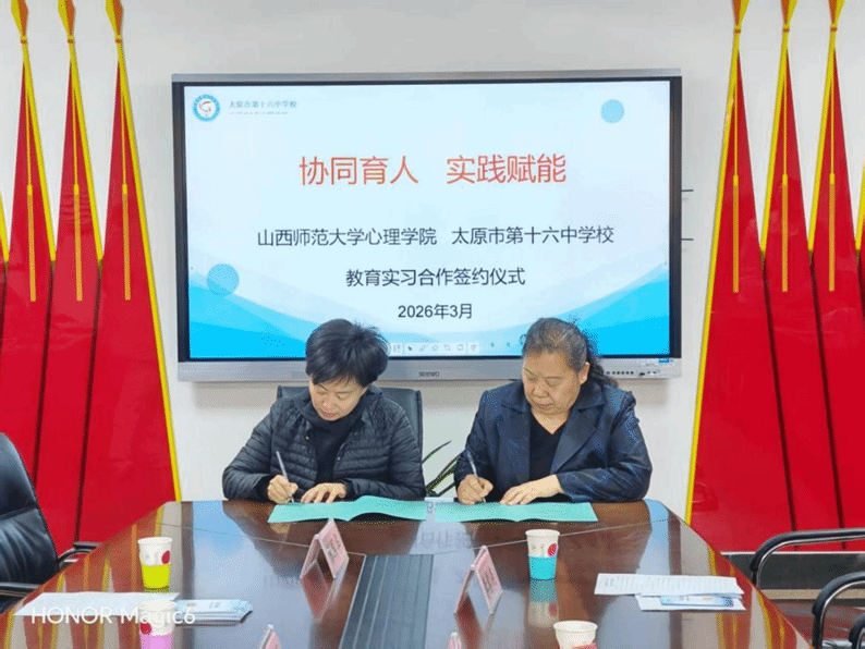 为深入推进协同育人机制,打造高水平教学科研实践实训基地,全面提升心理学专业服务基础教育的能力,2026年3月24日,我院与太原市第十六中学举行“教学科研实践实训基地”签约仪式。此次合作是贯彻落实新时代教师教育改革要求以及“健康第一”教育理念的重要举措,旨在通过院校深度合作,整合优质资源,构建“学、研、训、产”四位一体的高品质实践实训平台,推动基础教育高质量发展。
