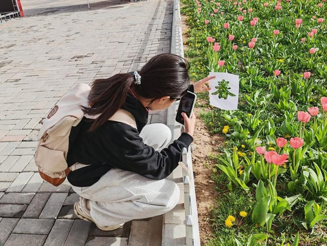 一笔墨色,绘尽春光。墨染春痕创意喷绘吸引众多同学参与,大家以花叶为模,随心喷绘、书写心愿,让情绪在创作中自然流淌,实现自我觉察与心灵释放。镜揽春光打卡点前,同学们驻足取景,捕捉校园里的治愈瞬间,在一框一景中感受当下的温暖与幸福。