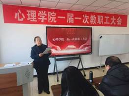 院长张潮代表学院作了题为《锚定目标启新航 守正创新促发展》的工作报告。报告全面回顾了2025年学院年在专业建设、人才培养、学科建设、师资队伍、社会服务、文化建设等方面取得的主要成绩。在专业建设方面,获批心理健康与社会服务微专业;心理健康教育研究社团入选2025年度“榜样100”全国优秀大学生社团榜单;本科生荣获各级各类奖项74项,其中国家级10项、省级16项;2025年考研率25.5%,就业落实率94.2%;收到实习单位感谢信3封;收到家长赠送锦旗4面;心理学专业主干课程《学校心理学》在秋季学期成为全国共享课;教师教育类课程《教育心理学》成为全国共享智慧慕课;《教育评价》课程以最新版本的AI慕课上线;完成智慧教育学院5门教师教育类课程知识图谱的架构和知识创新中心建设。在人才培养方面,我院共有33名师生分别参加了国际心理学大会、第26届全国心理学大会及中部心理学学术大会;硕士研究生获批4项省级和校级研究生学术创新项目,获得包括田家炳杯在内的各级各类专业比赛奖项35人次,占研究生总人数62.5%。学科建设上,顺利完成了心理学学位点的核验,获批包括教育部人文社科项目和山西省哲社科学重点项目等在内的各级各类项目21项;发表学术论文16篇,其中SCI/SSCI11篇,CSSCI1篇,普刊论文4篇,出版专著1部,国家级教材1部;形成咨政报告3份,其中省级1个,市级2个;承办了2025年山西省高校大学生心理健康教育教学专题培训研讨会和“生涯规划项目”专题研讨会。师资队伍建设方面,引进青年博士5人,1位教师外出攻读博士学位;1位副教授、2位讲师、1名助讲四位教师职称评审顺利晋级;专任教师获各类奖项12人次;有15位教师完成了教育部学业规划指导教师(高级)职业技能培训课程,获得职业技能培训证书;两位教授进入2025年心理学“全国高被引学者”Top5%行列;有6人次教师进入中国心理学会不同专业委员会担任委员。社会服务方面,完成平陆县和临汾市中小学校长心理教育能力提升培训;和团省委合作青少年心理服务12355热线;和教育厅思政处、职成处、幼教中心进行多次交流合作,和5家企业进行了调研交流;校内完成了教职工和硕士研究生心理普查报告及5494名师生的心理普查分析。学院文化建设方面,学院设计了院徽并进行了文字解读和微信公众号推送;制定了“三步走”的战略发展目标和“区域一流,特色鲜明”的战略定位;提出了“夯基础、强内涵;高站位、重服务”的具体举措;谋划了“1个目标、2项任务、3大理念和4大战略”的发展思路,制定了“以心治学、以理治院、以爱治教”的治院理念。全院师生在践行学院文化建设中形成了风清气正、积极向上的教学科研生态环境。在学校所有的违规违纪中实现“零”通报。报告提出了2026年工作的宏伟蓝图,以“深耕师范底色、深化内涵建设、拓展发展维度”为核心,聚焦心理学学科和专业的深度发展和宽度扩展,全面提升办院质量与核心竞争力。具体举措包括:1.深化专业建设,铸牢师范根基,推动培养模式提质升级。2.强化学科发展:聚焦核心方向,推动交叉融合与特色突破。3.加强教师队伍建设,优化结构素养,打造高水平教学科研团队。4.深化社会服务,锚定教育需求,彰显师范特色与社会价值。报告强调,学院将坚持立德树人根本任务,深化教育教学改革,强化内涵建设,全面提升办学水平和育人质量,努力建设特色鲜明、区域领先的一流学院。